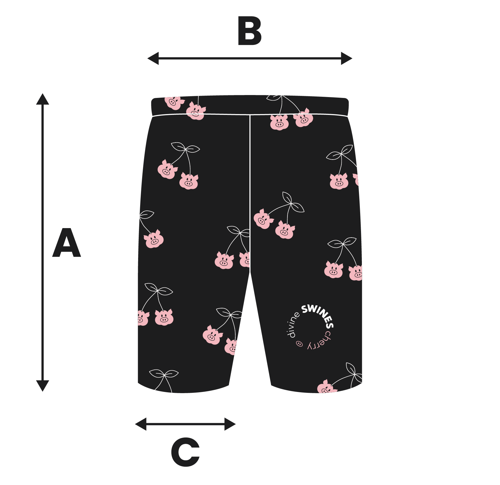 Po bokach – białe paski, które dodają charakteru i wyraźnie wyróżniają sylwetkę. Autorski nadruk divine SWINES z różowymi świnkami i szypułkami wiśni dopełnia całość – odważnie, ale z dystansem. Spodenki mają praktyczne kieszenie, bo styl nie musi oznaczać rezygnacji z